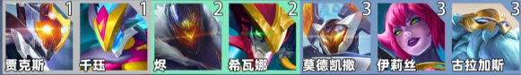 3、【雷克斯、千珏、烬、希瓦娜、莫德凯撒、伊莉丝、古拉加斯】